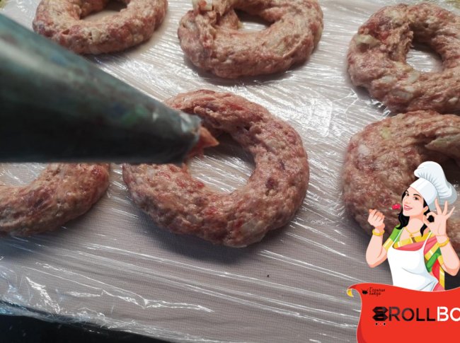 Затем положила этот фарш в кондитерский мешок. Отрезала кончик и отсадила мясные кольца на доски, укрытые пищевой пленкой. Можно просто сформировать шарики, а потом сделать в середине отверстие.