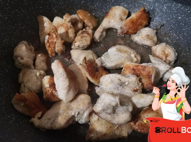 Сначала я нарезала куриное филе крупными кусочками. Посолила, поперчила и обжарила на смеси сливочного и растительного масла в течение 15-20 минут.