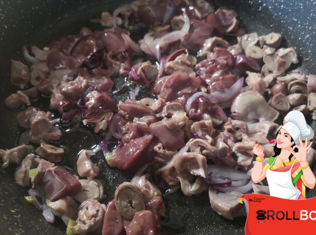 Затем добавляем нарезанные вареные сердечки и желудочки, а также нарезанную печень, очищенную от жилок.