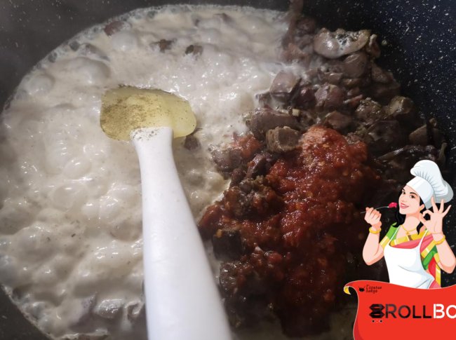 Видим, что печень побелела со всех сторон, добавляем аджику и сливки.
