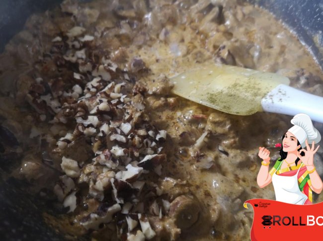 Тушим минуты две... Добавляем нарезанный ножом грецкий орех (можете использовать блендер, но в пыль ничего перемалывать не надо). Солим, перчим... Выключаем огонь.