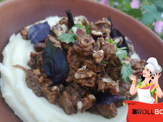 Ингредиенты Картофельный крем: картофель - 250 гр. соль по вкус сливки 20% - 100 мл сливочное масло - 15-20 гр. Кучмачи: куриные желудки - 100 гр. куриные сердечки - 100 гр. куриная печень - 100 гр. красный лук - 40 гр. (поллуковицы) перец чили по вкусу (2 гр.) чеснок - 4 зубчика уцхо-сунели - 1