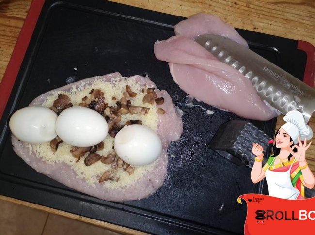 Ингредиенты куриное филе - 2 шт. вареные яйца - 3 шт. шампиньоны - 4-5 шт. тертый пармезан ~ 50-60 гр. сметана - 3 ч.ложки соль, молотый черный перец по вкусу Приготовление Сегодня получился неплохой куриный рулетик... Решила поделиться рецептом У филе я отрезала малое филе... оно потом пойдет у