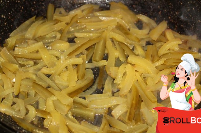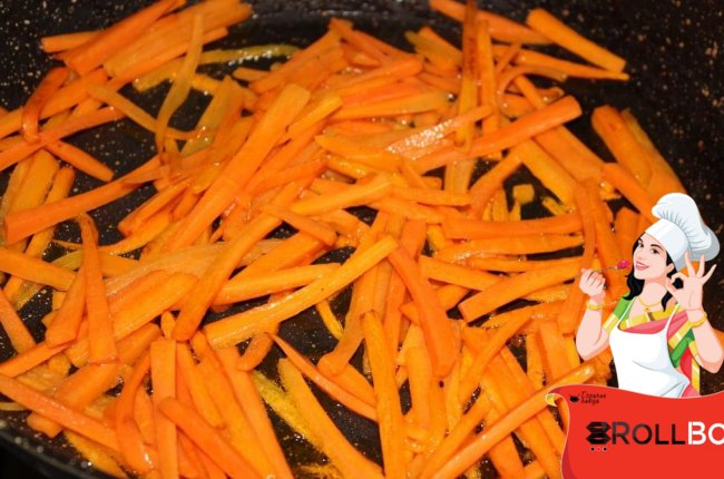 Морковь отправляем в кастрюлю, а в сковороду отправляем огурцы и слегка обжариваем.