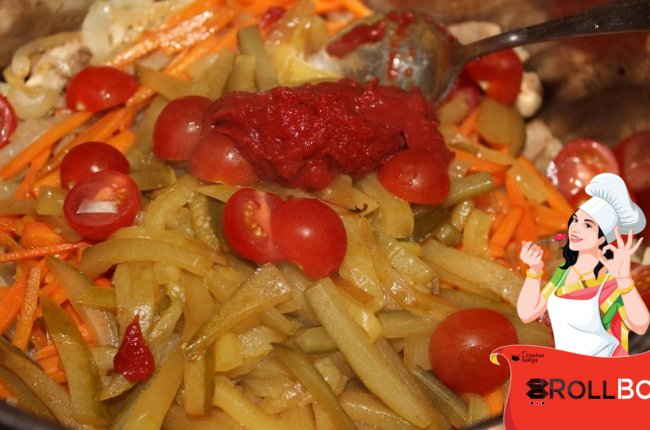В кастрюлю кладём помидоры, томатную пасту и выливаем сок от мяса.