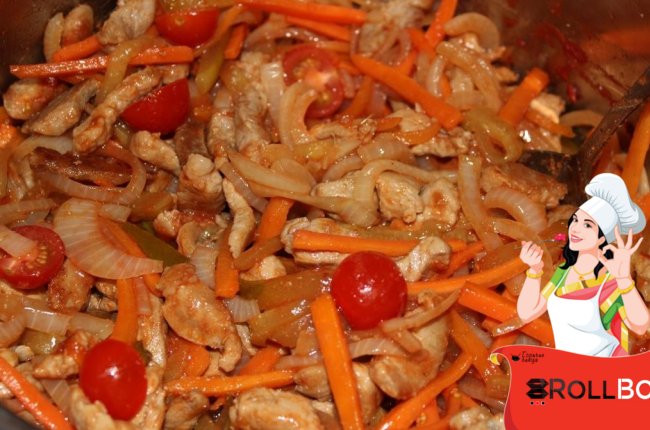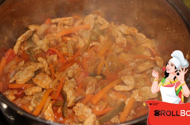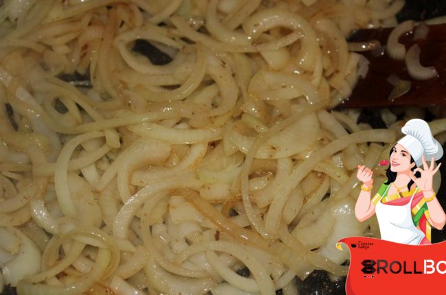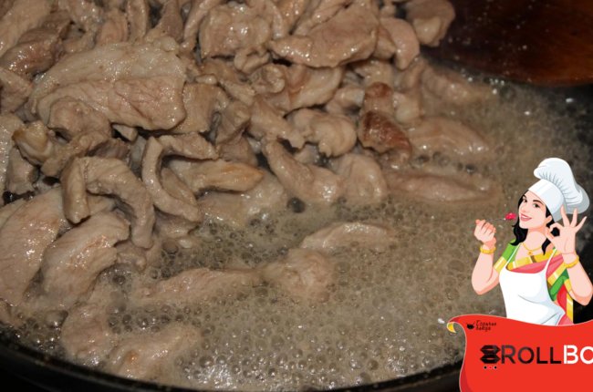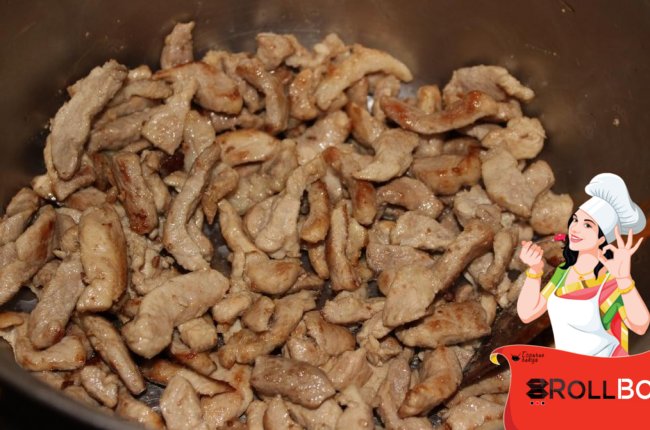 Сковороду разогреть с растительным маслом и обжарить мясо. В сковороде образуется сок, его нужно будет убрать ложкой. Не выливаем, он ещё пригодится.