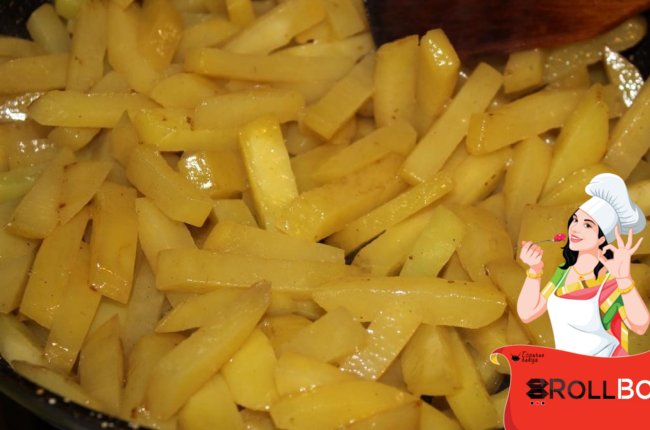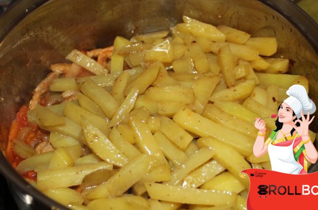 На той же сковороде, где обжаривались мясо и овощи, обжариваем картошку до полуготовности. Масло практически не добавляем.