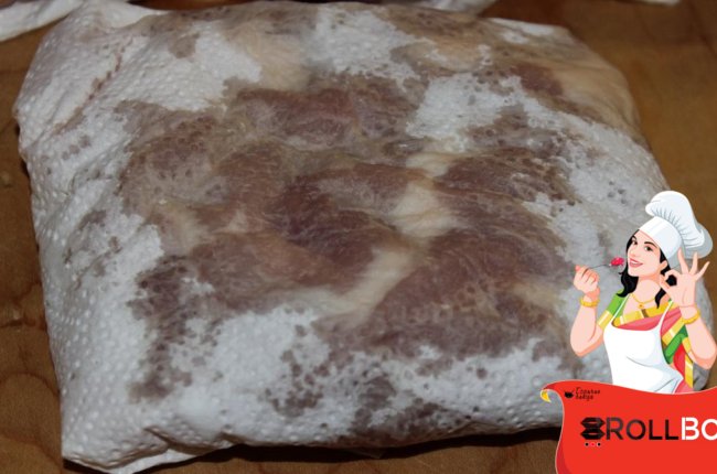 Мясо хорошо отжать и порциями выложить на бумажное полотенце, завернуть в конверты, чтобы впиталась лишняя жидкость. Это нужно для того, чтобы мясо не тушилось, а именно жарилось.
