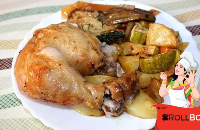 Ингредиенты курица картофель лук морковь сладкий перец чеснок кабачок кусок сливочного масла(примерно 50-60 г ) 0щной или куриный бульон (можно из кубика) или вода( примерно 120-130 мл) 2ст.л. - растите,5 ч.л.- сухого чеснока соль перец приправа для курицы овольного масла приправа для картофеля