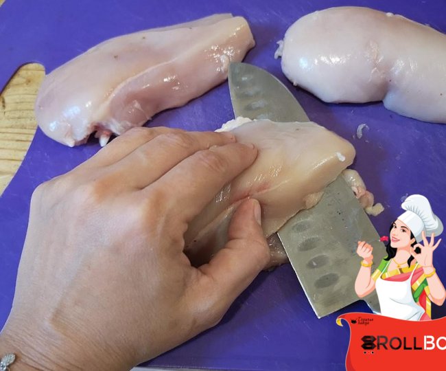 У куриной грудки (которая у меня была без кости), отрезала малое филе... оно пошло у меня потом в суп.