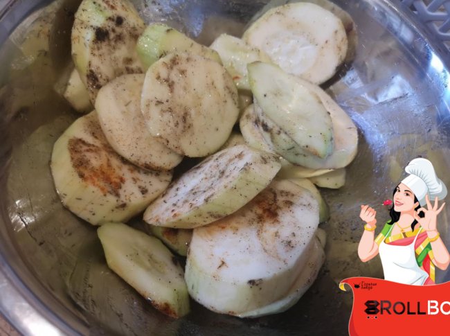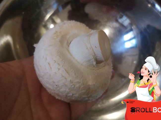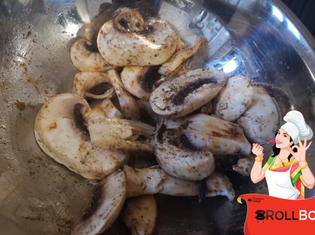 Шампиньоны у меня были просто огромные... взяла 2 шт., можно и больше, конечно... нарезала слайсами... чем толще, тем сочнее и вкуснее получатся. Нарезайте тоже толщиной в 1 см.