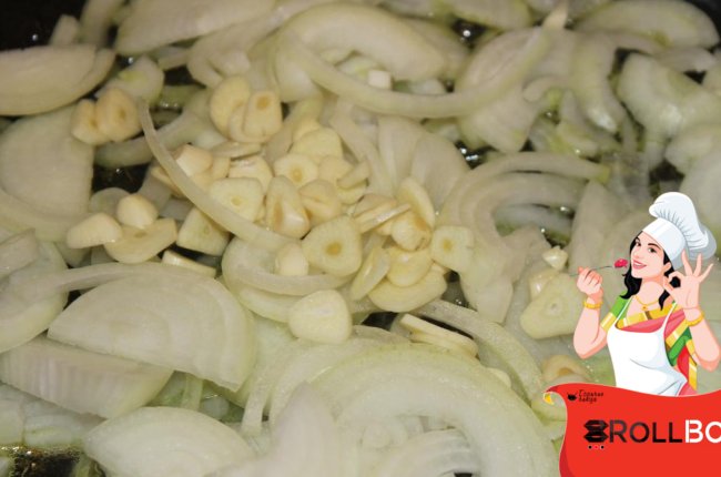 Лук нарезать полукольцами, чеснок тонкими дольками