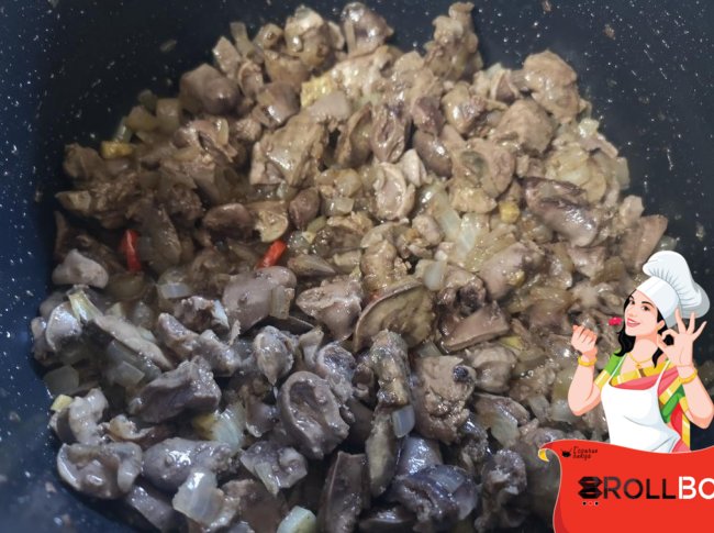 Добавляем отварные желудочки и сердечки. Жарим минуты две.