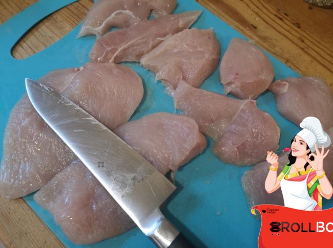 Сначала я занялась куриным филе... отрезала малое филе... большое филе разрезала поперек, а потом разделала его на шесть частей...