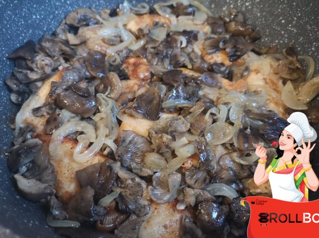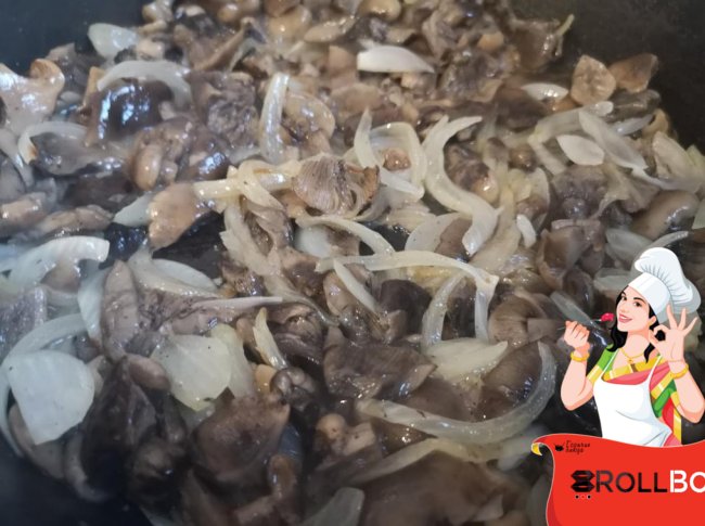 Репчатый лук почистила, нарезала полукольцами... обжарила на растительном масле... потом добавила к луку отварные грибы (у меня опята... все делала на глаз, так что вес не подскажу, две хорошие горсти уже отваренных опят получилось... конечно, можно положить шампиньоны, которые варить уже не надо)... Немного обжарила, посолила, поперчила.