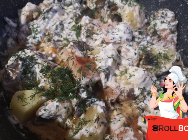 потом сверху положила нарезанный вареный картофель. Залила все сливочно-сырным соусом... Прогрела все... Перемешала... Посыпала зеленью укропа (можно петрушкой посыпать).