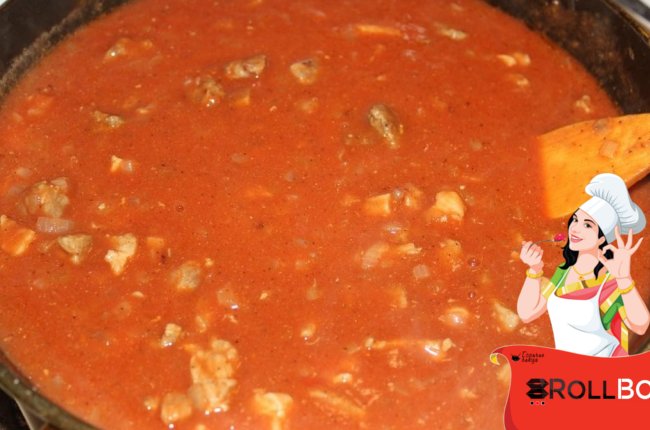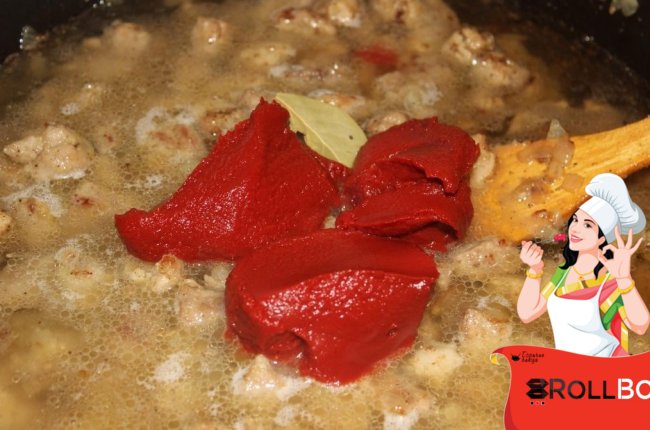 Залить горячим бульоном или водой, положить лавровый лист и томатную пасту.