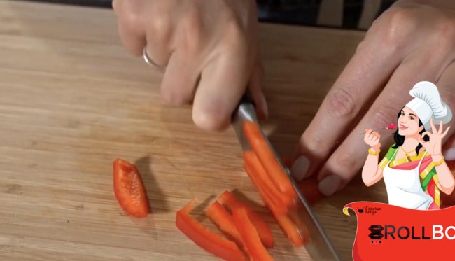 Чеснок и шампиньоны слайсами, морковь на крупной терке. Перец брусочками небольшими, стручки пополам.