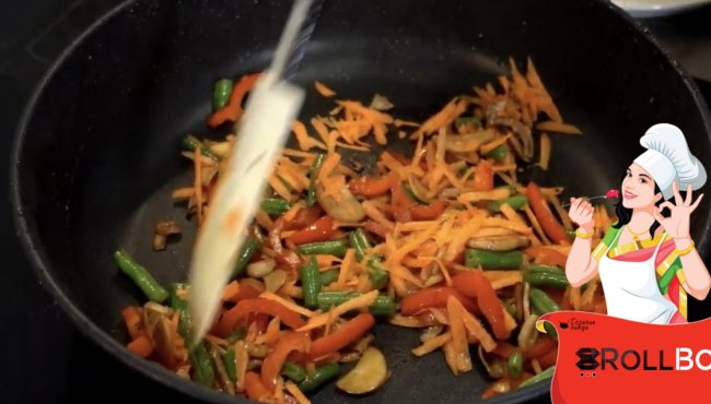Затем отдельно обжарьте овощи. Сначала чеснок, затем шампиньоны, жарьте пару минут, перец, снова минута-две, фасоль, и снова минута.