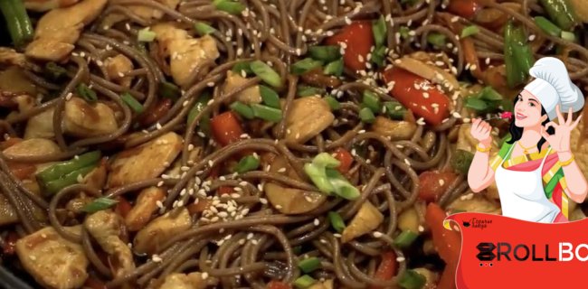 Ингредиенты Гречневая лапша — 200 гр. Шампиньоны — 2-3 шт. Чеснок — 2 зубчика Оливковое масло — 50 гр. Болгарский перец — 100 гр. Фасоль/горох стручки — 50 гр. Морковь — 1 шт. Куриное филе — 100 гр. Соевый соус — 3 ст.л. Рисовый уксус — 3 ст.л. Кунжутное масло — 2 ст.л. Кунжут горсть Приготовление