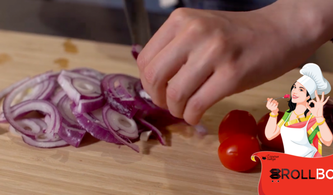 Готовим соус. режем лук полукольцами, помидорки чери пополам.