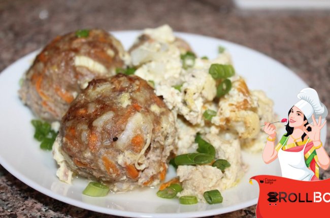Цветную капусту моем, и разделываем на соцветия. Формуем мясные тефтельки из фарша и выкладываем в форму для запекания, оставляя место для цветной капусты. В промежутки "вставляем" соцветия капусты.