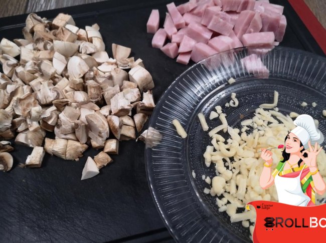 Ингредиенты ветчина - 100 гр. шампиньоны - 70-75 гр. (у меня было 7 шт.) тертый сыр - 30 гр. (у меня обычный российский) сливочное масло - 50 гр. мука - 1 ст.ложка молоко - 300 гр. соль, молотый черный перец по вкусу яйца - 3 шт. поджаренный хлеб Приготовление Сначала нарезаем ветчину и грибы