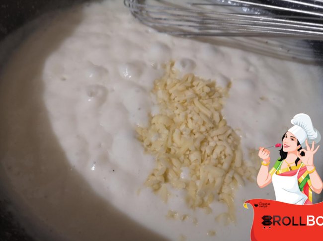 Мука разошлась, добавляем молоко... Опять же мешаем венчиком, а то все может подгореть. В этот момент солим... Можно добавить щепотку мускатного ореха, но я его не люблю... А кладу довольно много свежемолотого черного перца. Молоко быстро загустевает, буквально за 3-4 минуты. Добавляем тертый сыр, даем ему расплавиться... Опять же не забываем про венчик