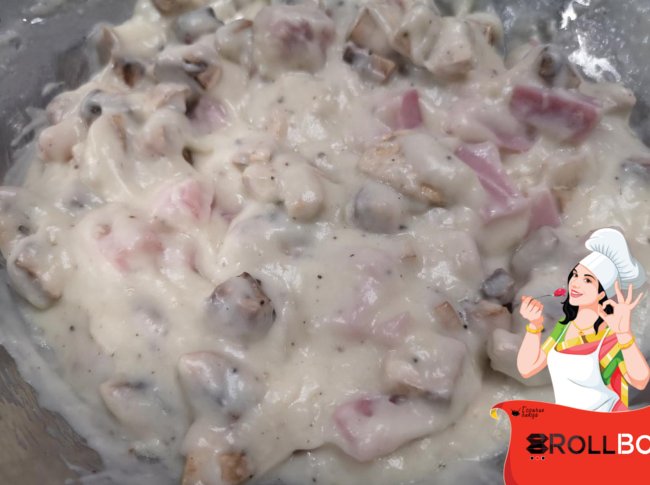 Ветчину и шампиньоны выкладываем в миску, добавляем туда наш соус. Все перемешиваем.
