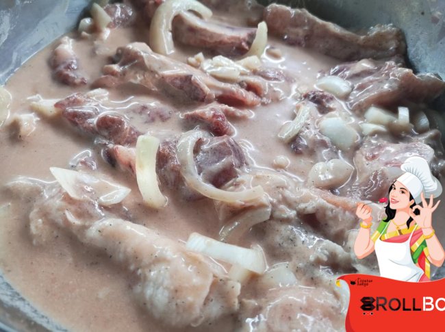 Ингредиенты свинина - 2 кг репчатый лук - 3 шт. соль, молотый черный перец по вкусу кефир - 300 мл томатный сок - 300 мл Приготовление У меня была средняя часть ребер с мясом и жиром... Я их разрезала на куски. Мясо было довольно жирное... Посолила, поперчила все с двух сторон... Уложила в миску.