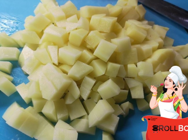Сначала надо отварить очищенный картофель, нарезанный кубиками, в кипящей подсоленной воде. У меня картошка варилась минут 8. Смотрите сами, доводите до готовности. Потом воду слейте...