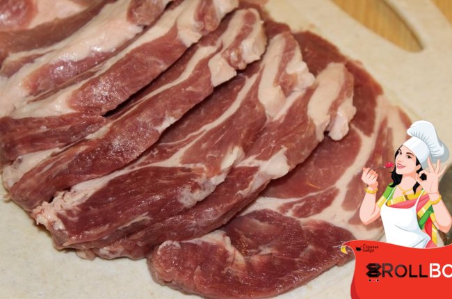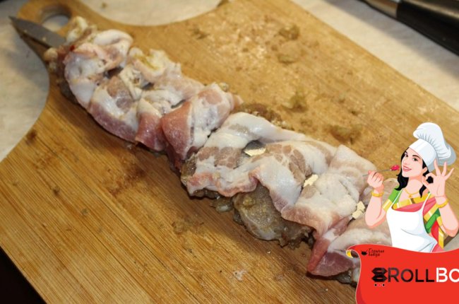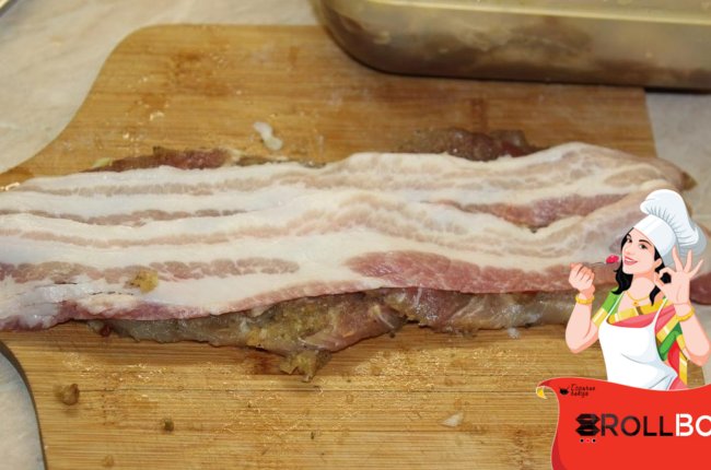 Кусочки замаринованного мяса нарезать на полоски, сверху мяса положить полоски бекона