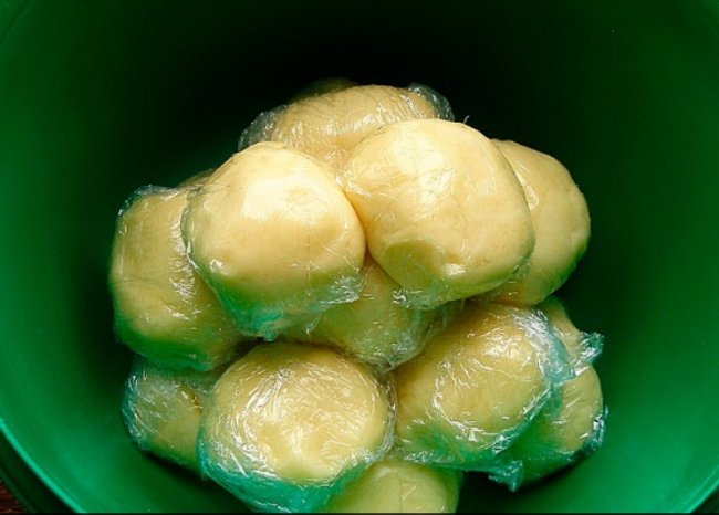 - Поделить готовое тесто на 15 одинаковых кусочков. Каждый скатать в шарик и обернуть пищевой пленкой. Отправить в холодильник на несколько часов.