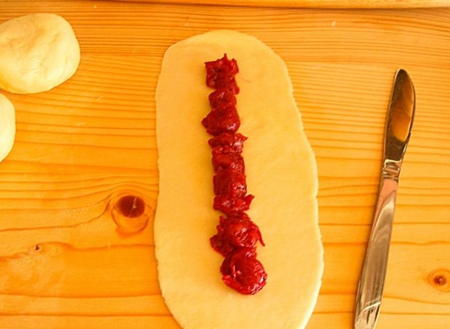 - Как только тесто достаточно полежит в холодильнике, извлечь его оттуда и раскатать каждый шарик в полосу. В середину каждого положить ягоды.