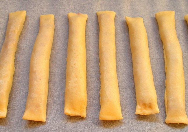 - Выложить трубочки на противень и отправить в духовку, прогретую до 200 градусов. Выпекать 20 минут.