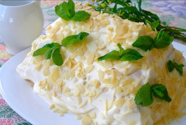 - Залить оставшимся йогуртом. Поставить торт в холодильник, чтобы крем дошел до нужной кондиции.