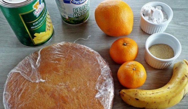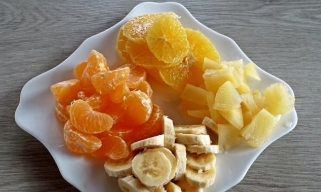 - Апельсин почистить и нарубить кружками. Измельчить банан и ананас. Очищенный мандарин поделить на дольки.