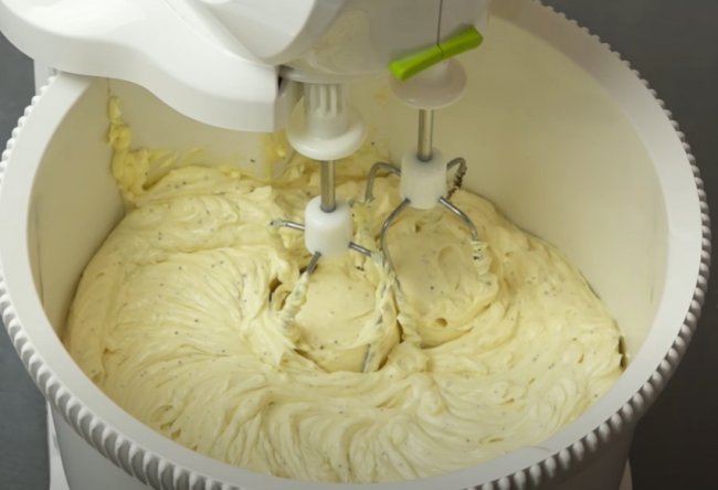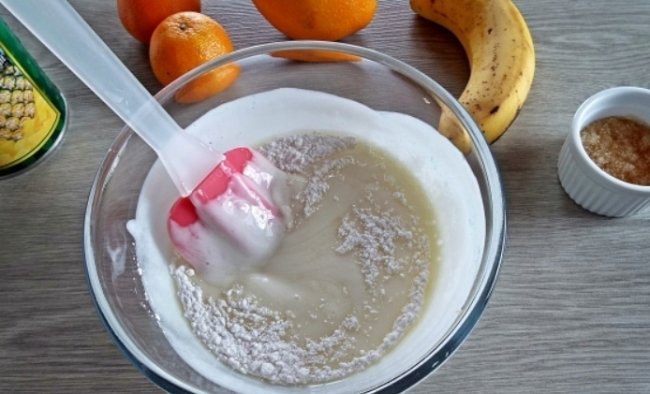 - Аккуратно всыпать в заготовку муку, продолжая взбивать.