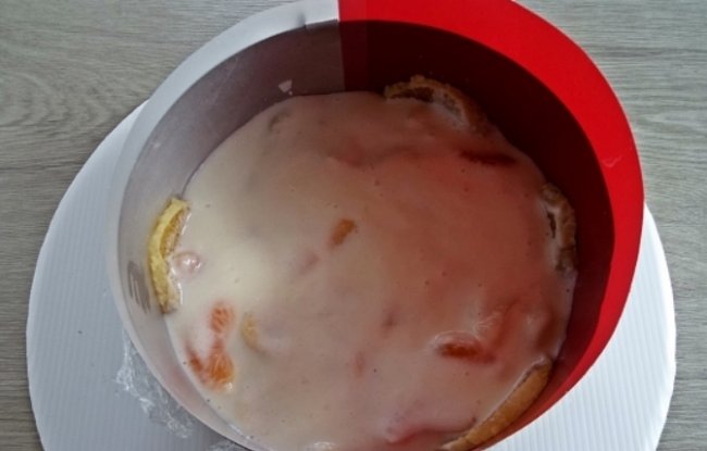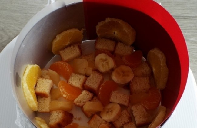 - Выстелить дно и бока формы пленкой. Разложить внутри фрукты и бисквит. Кружки апельсинов разместить у стенок.