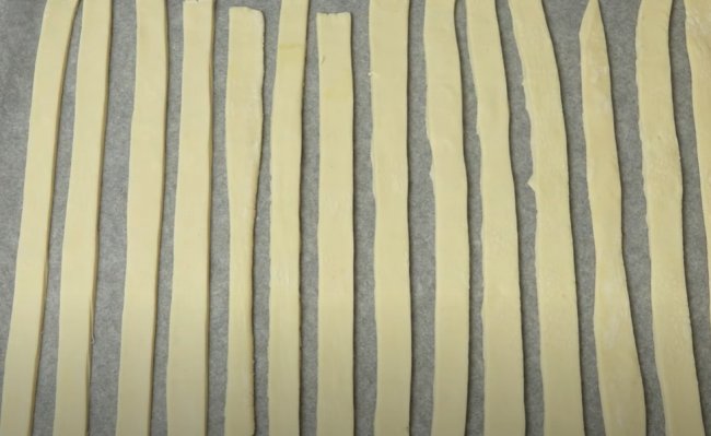 - Раскатать слоеное тесто и нарезать полосками. Отправить на противень, застеленный пергаментом. Поставить в духовку, прогретую до 200 градусов, на 15 минут.