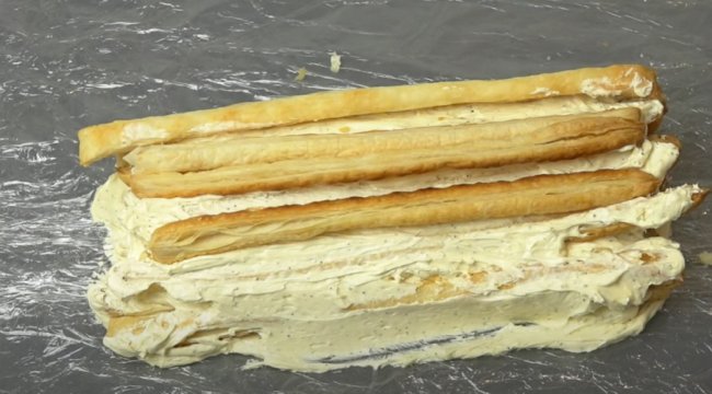 - Расстелить на столе пищевую пленку в несколько слоев. Положить туда крем, а потом несколько палочек. Сверху положить снова крем, потом опять палочки (несколько оставить для украшения).