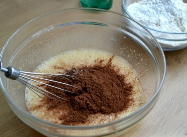 - Добавить к полученной массе оба вида муки, какао и разрыхлитель. Довести до однородности.