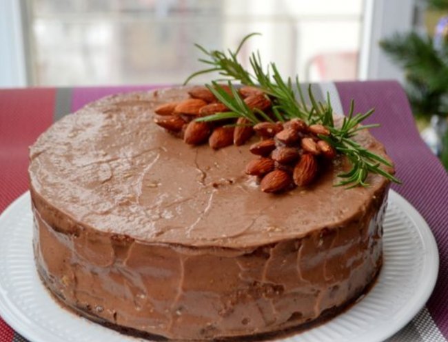 - Положить овальные заготовки на торт и воткнуть в них орехи так, чтобы они имитировали чешуйки. Для веточек можно использовать розмарин или тимьян, а для большей оригинальности используют настоящие еловые ветви.