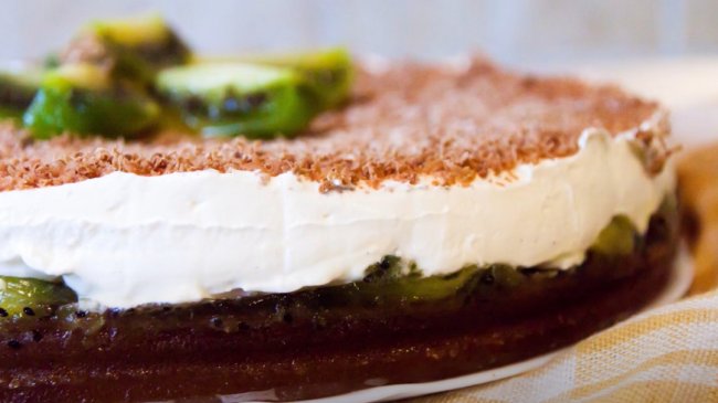 - Извлечь торт, положить на красивую тарелку и разложить на верхушке кусочки киви. При желании присыпать сахарной пудрой.