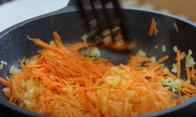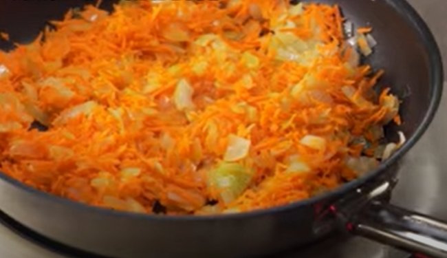 - На сковороде с небольшим количеством масла до прозрачности обжариваем лук, а затем добавляем к нему морковь и продолжаем жарить до мягкости всех овощей.