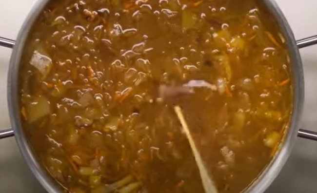 - Затем в суп вливаем капустный рассол, подсыпаем молотый перец, перемешиваем, снимаем с огня и даем супу хорошо настояться в течение 2 часов.