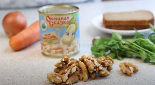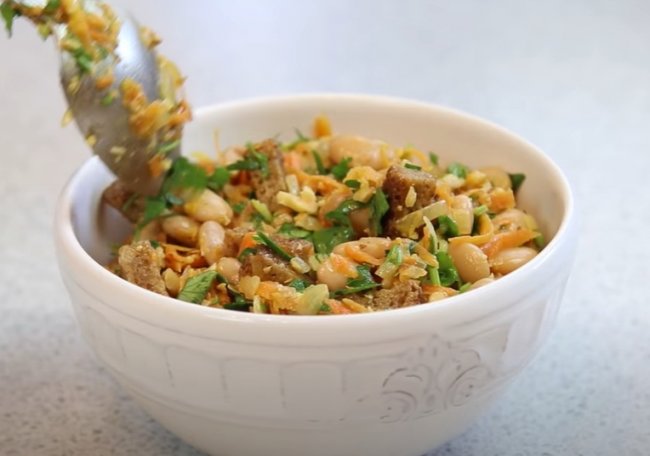 С фасолью можно приготовить еще один вкусный и питательный салат, в котором прекрасно сочетаются бобы, грецкие орехи и хрустящие сухарики. Салат получается вкусным и даже пикантным.