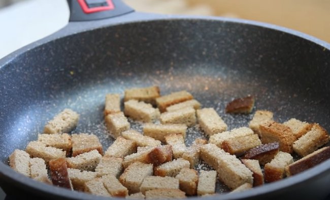 - Пока овощи остывают, на сковороду отправляем кубики хлеба и обжариваем до румяности (сухарики можно немного посолить).