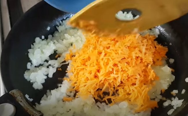 - К луку добавляем морковь и обжариваем до мягкости.