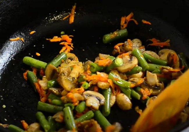 - Как только морковь станет мягкой, добавляем к ней стручковую фасоль и предварительно протушенные шампиньоны. Овощи солим и приправляем любыми специями по вкусу.